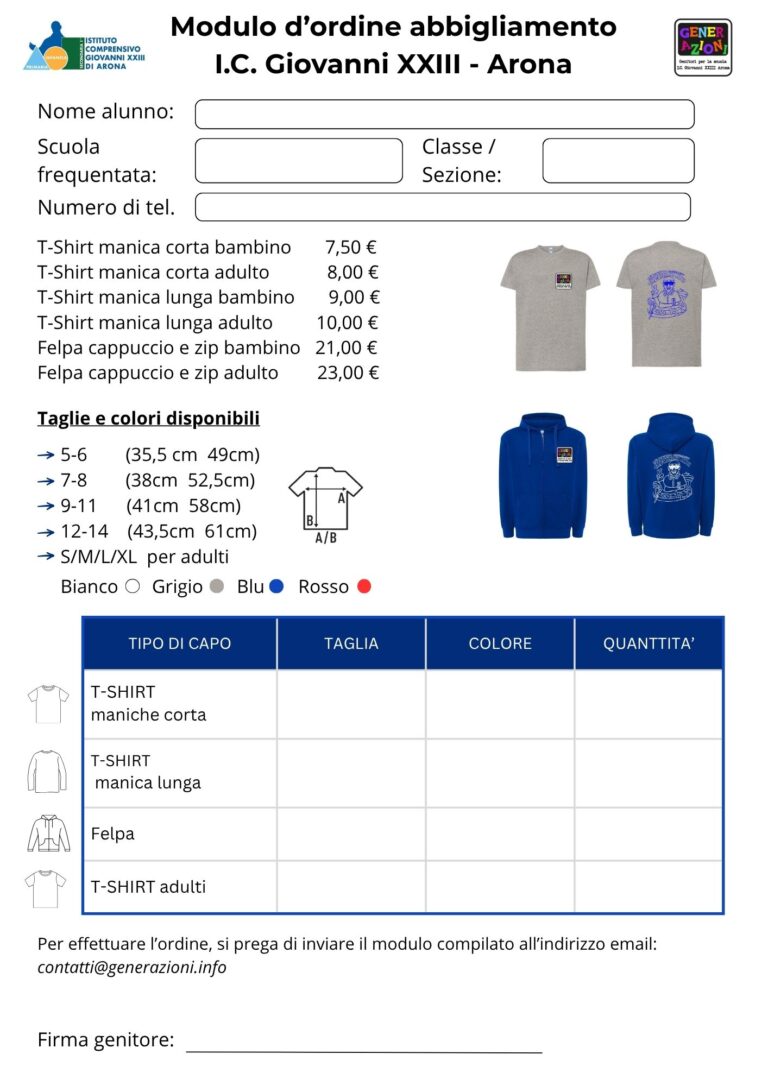 Per acquistare l’abbigliamento con il logo dell’Istituto Comprensivo e dell’associazione genitori GenerAzioni compila il seguente modulo e invia l’ordine entro il 31 ottobre a contatti@generazioni.info.